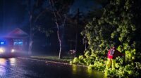 Aksi Sigap, Personil Polsek Cikijing Evakuasi Pohon Tumbang Yang Menutup Setengah Badan Jalan
