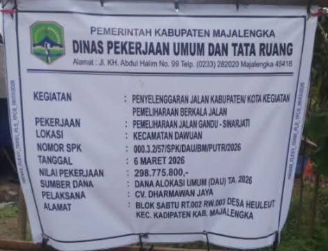 Proyek itu sendiri berdasarkan papan informasi kegiatan merupakan proyek Pemkab Majalengka melalui Dinas PUTR Majalengka. Adapun besar anggaran diketahui bernilai sebesar Rp.298.775.800 (dua ratus sembilan puluh delapan juta, tujuh ratus tujuh puluh lima ribu, delapan ratus rupiah) anggaran tersebut bersumber dari Dana Alokasi Umum (DAU) TA 2026.