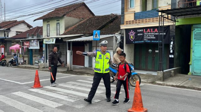 Ps. Panit Lantas Polsek Cikijing Laksanakan Gatur Pagi, Pastikan Keselamatan Anak Sekolah Saat Menyeberang Jalan