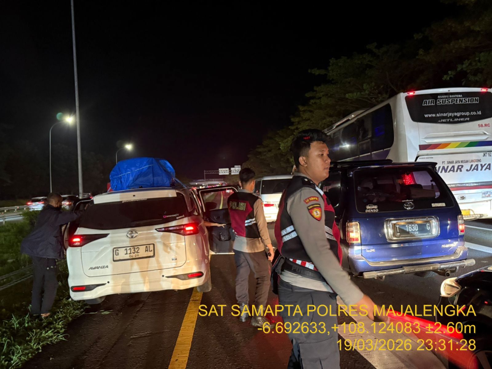 Majalengka, // Zonakabar.com Dedikasi tanpa batas ditunjukkan jajaran Polres Majalengka dalam mengawal arus mudik Operasi Ketupat Lodaya 2026 hingga larut malam. Pada Kamis malam (19/3/2026) sekitar pukul 23.00 WIB, personel Satuan Samapta memberikan pertolongan pertama kepada pemudik yang mengalami kendala teknis pecah ban di ruas Tol Cipali KM 152 Jalur B.