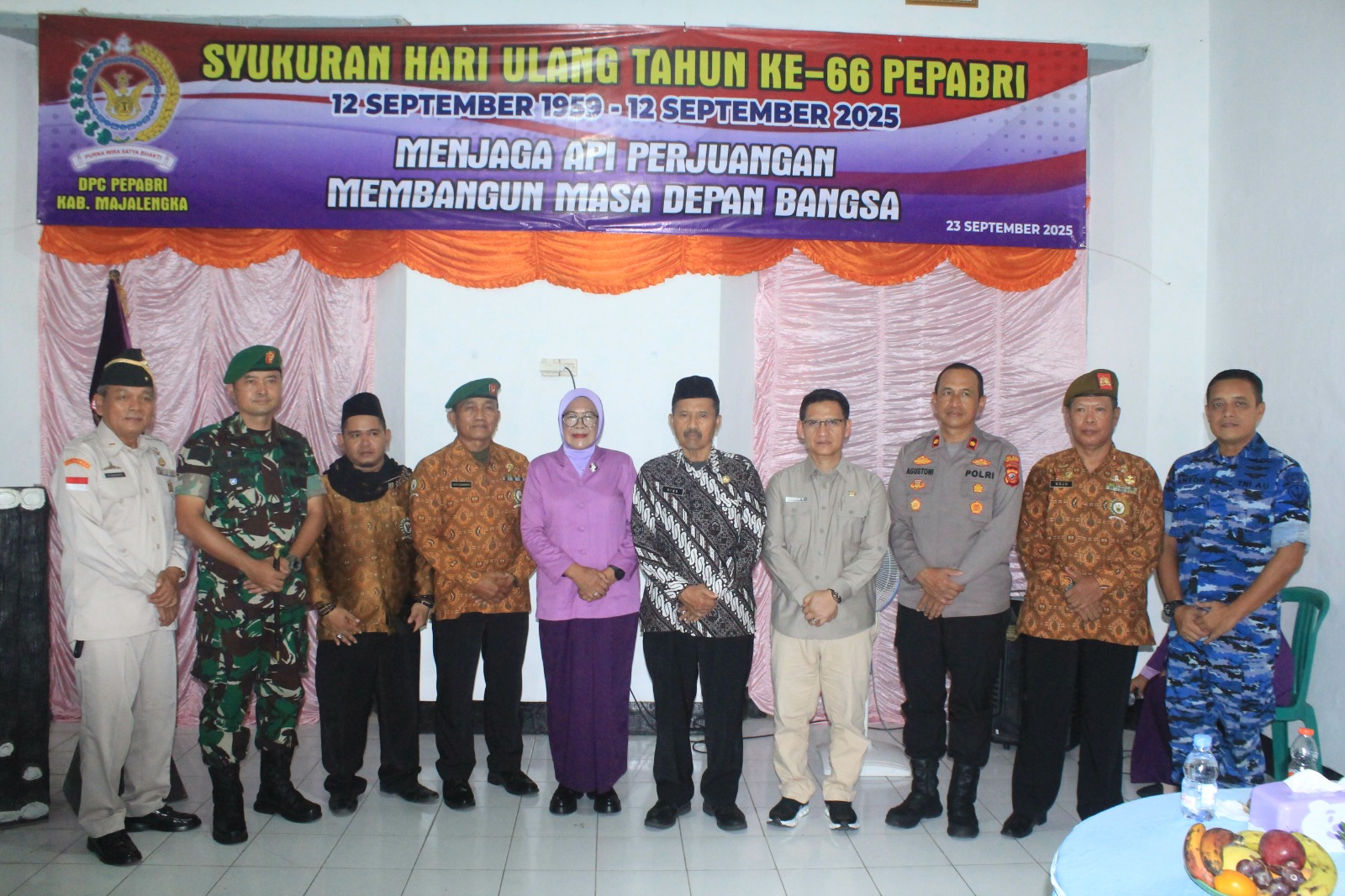 Majalengka // Zonakabar.com – Komandan Kodim (Dandim) 0617/Majalengka, Letkol Inf Fahmi Guruh Rahayu, menghadiri acara Syukuran Hari Ulang Tahun (HUT) ke-66 Persatuan Purnawirawan dan Warakawuri TNI-Polri (Pepabri) tingkat Kabupaten Majalengka, Selasa (23/9/2025). Kegiatan berlangsung di Gedung Juang Majalengka, Jalan KH Abdul Halim, Kelurahan Majalengka Kulon, Kabupaten Majalengka.