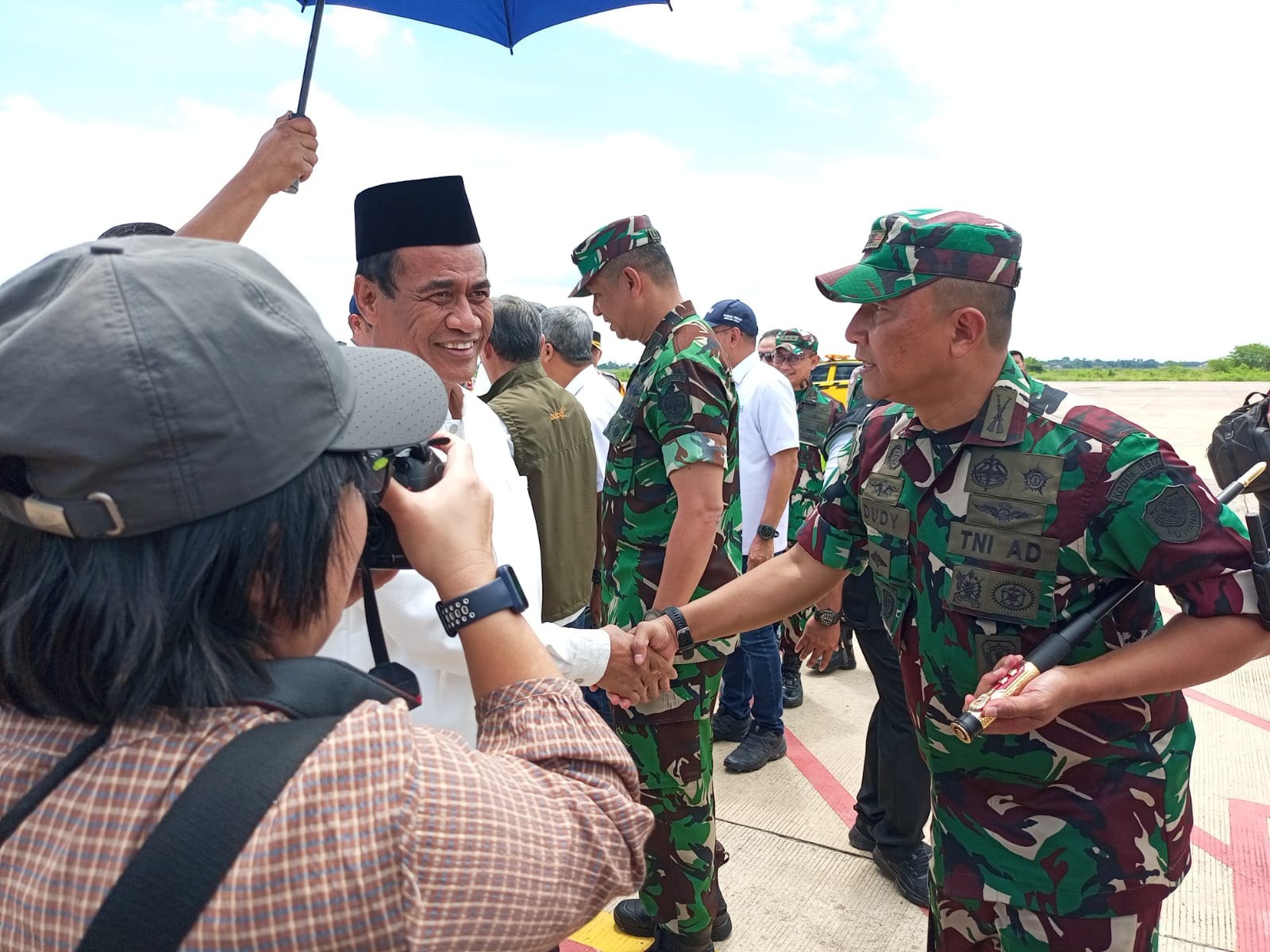 Rombongan Menteri Pertanian tiba menggunakan pesawat Unscheduled Type C680 NG dengan nomor registrasi N977JH dan mendarat pada pukul 11.21 WIB. Turut serta dalam rombongan antara lain Tenaga Ahli Mentan Andi Irfan, Ahmad Musa, ADC Mentan Kapten Inf Andra Wilana, serta Walpri Mentan Angga.