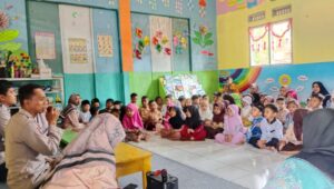 Kegiatan yang berlangsung penuh keakraban ini disambut hangat oleh para guru, murid, serta orang tua murid yang turut hadir. Dalam kesempatan tersebut, petugas kepolisian memberikan pengetahuan sederhana namun bermanfaat, mulai dari pengenalan rambu-rambu lalu lintas, tugas dan fungsi kepolisian, hingga edukasi mengenai pola hidup bersih dan sehat dalam kehidupan sehari-hari.