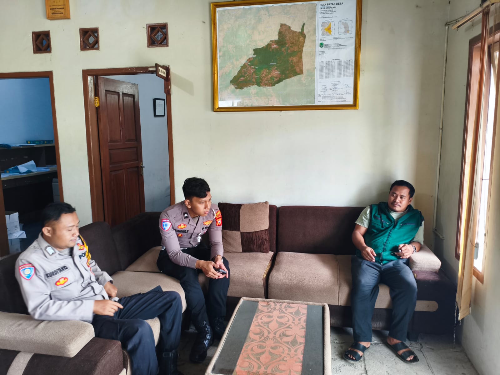 Majalengka Zonakabar.com – Bhabinkamtibmas Polsek Cikijing Polres Majalengka Polda Jabar, Bripka Kurdiyanto bersama Bripda Thoriq melaksanakan sambang silaturahmi dengan Perangkat Desa Jagasari guna berkoordinasi mengenai perkembangan Kamtibmas serta menjalin hubungan yang baik, Kegiatan ini berlangsung di Kantor Desa Jagasari, Kecamatan Cikijing, Kabupaten Majalengka pada Jum’at (19/09/2025).