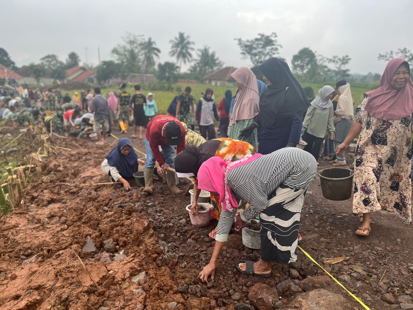 Dengan penuh semangat, para ibu-ibu ikut bergotong royong mengangkut material dan merapikan batu pada badan jalan bersama anggota Satgas TMMD. Kehadiran mereka menjadi bukti tingginya antusiasme masyarakat dalam mendukung pembangunan infrastruktur desa.