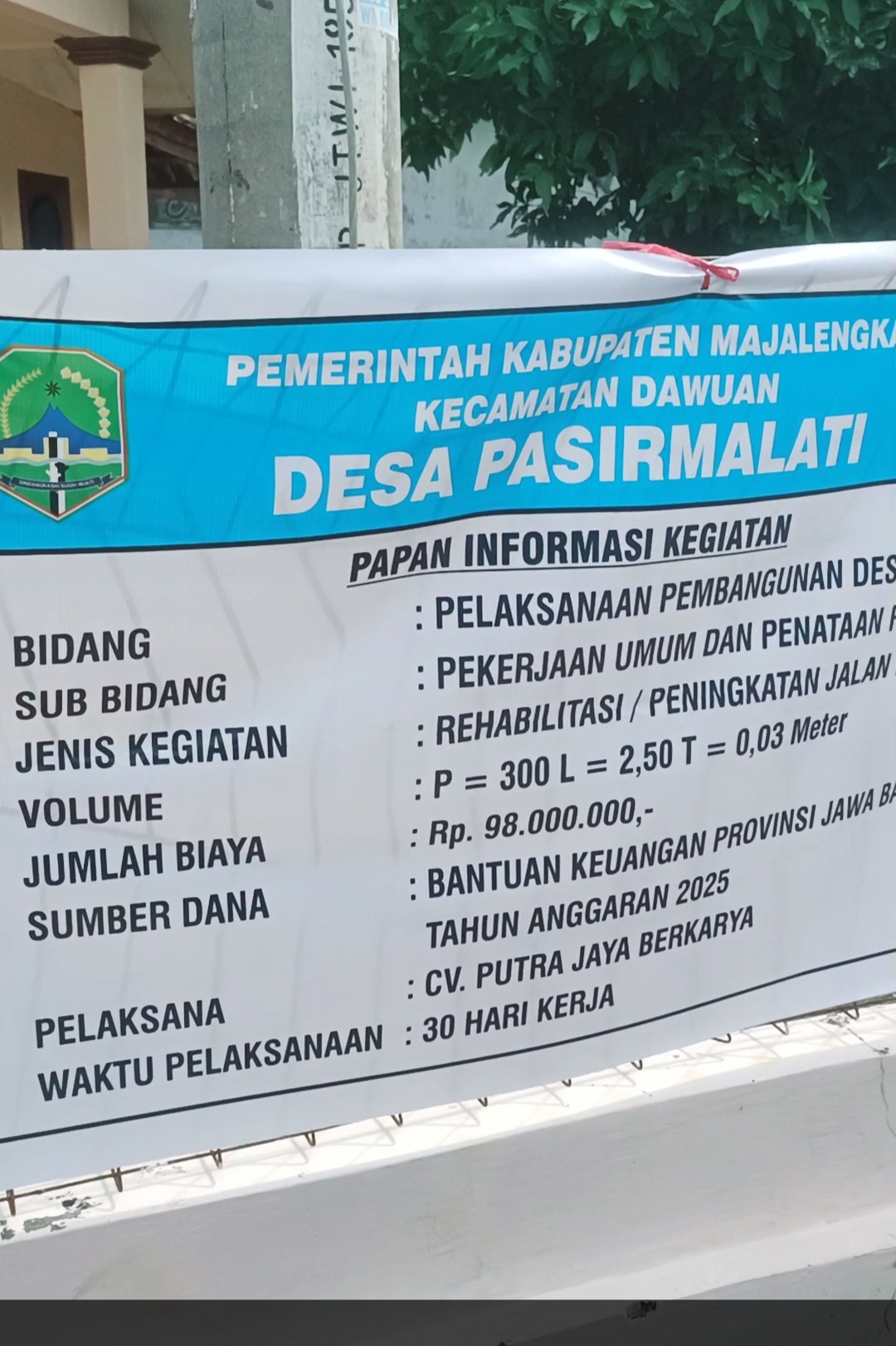 Dari papan informasi kegiatan yang dipasang di sekitar lokasi pengaspalan, tertulis jika proyek tersebut berasal dari anggaran Bantuan Keuangan Provinsi Jawa Barat Tahun Anggaran 2025 yakni sebesar Rp.98.000.000 (Sembilan Puluh Delapan Juta Rupiah). Dengan volume P=300, L=2,50 serta Tinggi T=0,03 proyek pengaspalan jalan Desa Pasirmalati ini dikerjakan oleh CV. PUTRA JAYA BERKARYA.