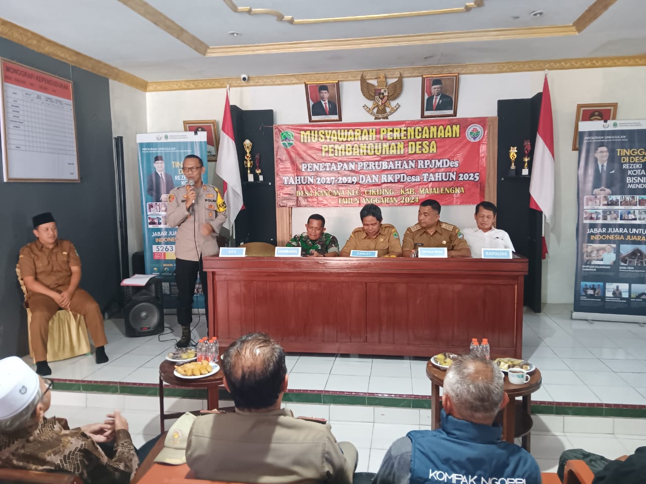 Majalengka, Zonakabar.com – Kapolsek Cikijing Polres Majalengka Polda Jabar AKP Asep Rusmawan, S.H. menghadiri pelaksanaan Musrenbangdes dalam rangka perubahan RPJMDesa tahun 2020-2027 dan penyusunan RKPDes Tahun 2025 di Aula Desa Kancana, Kecamatan Cikijing, Kabupaten Majalengka, Selasa (08/10/2024).