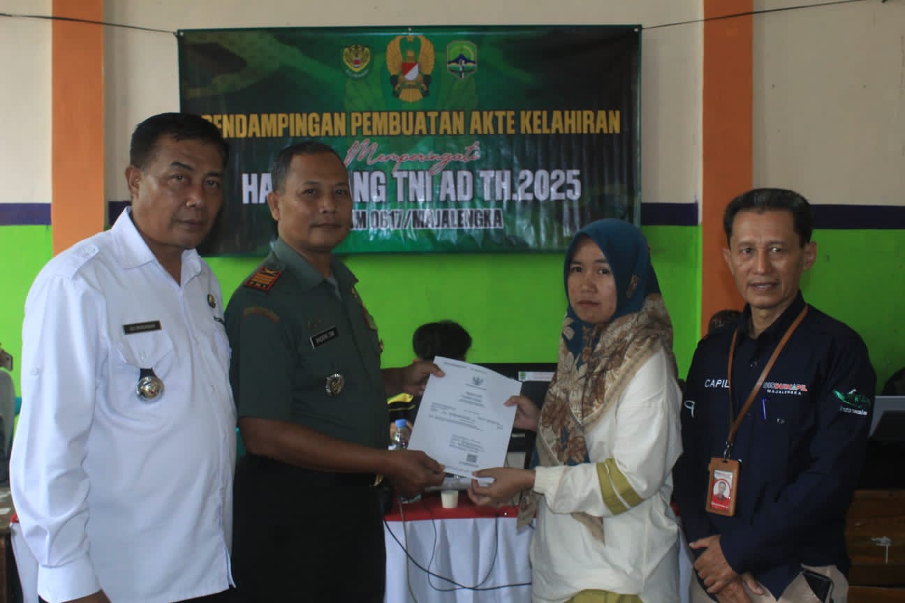 Majalengka // Zonakabar.com – Dalam rangka memperingati Hari Juang TNI AD Tahun 2025, Kodim 0617/Majalengka melaksanakan kegiatan pendampingan pembuatan Akta Kelahiran bagi masyarakat. Kegiatan tersebut berlangsung pada Rabu (19/11/2025) bertempat di Aula Desa Lebakwangi, Kecamatan Malausma, Kabupaten Majalengka.