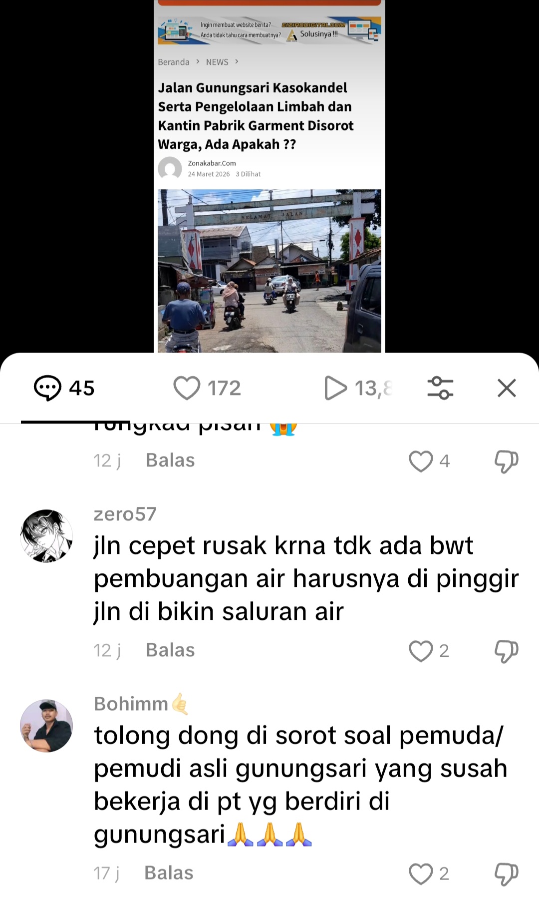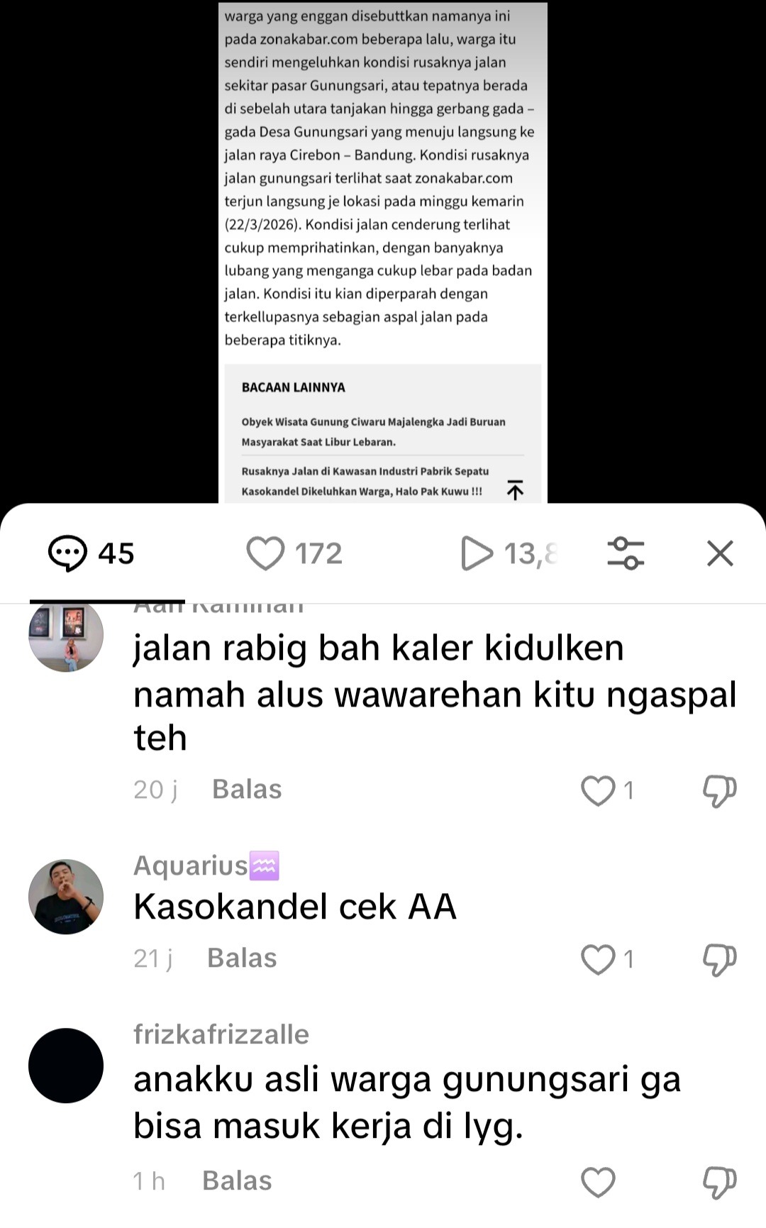 Pasalnya menurut penuturan sejumlah netizen, salah satunya akun medsos tiktok @Bohimm dalam cuitan komentar nya dalam postingan tiktok @zonakabar majalengka. @Bohmann menyoroti soal pemuda pemudi asli putra daerah Desa Gunungsari yang diduga kesulitan untuk dapat bekerja di pabrik yang notabene berdiri di wilayahnya. ” @Bohimm:tolong dong di sorot soal pemuda/pemudi asli gunungsari yang susah bekerja di pt yg berdiri di gunungsari “, cuitnya.