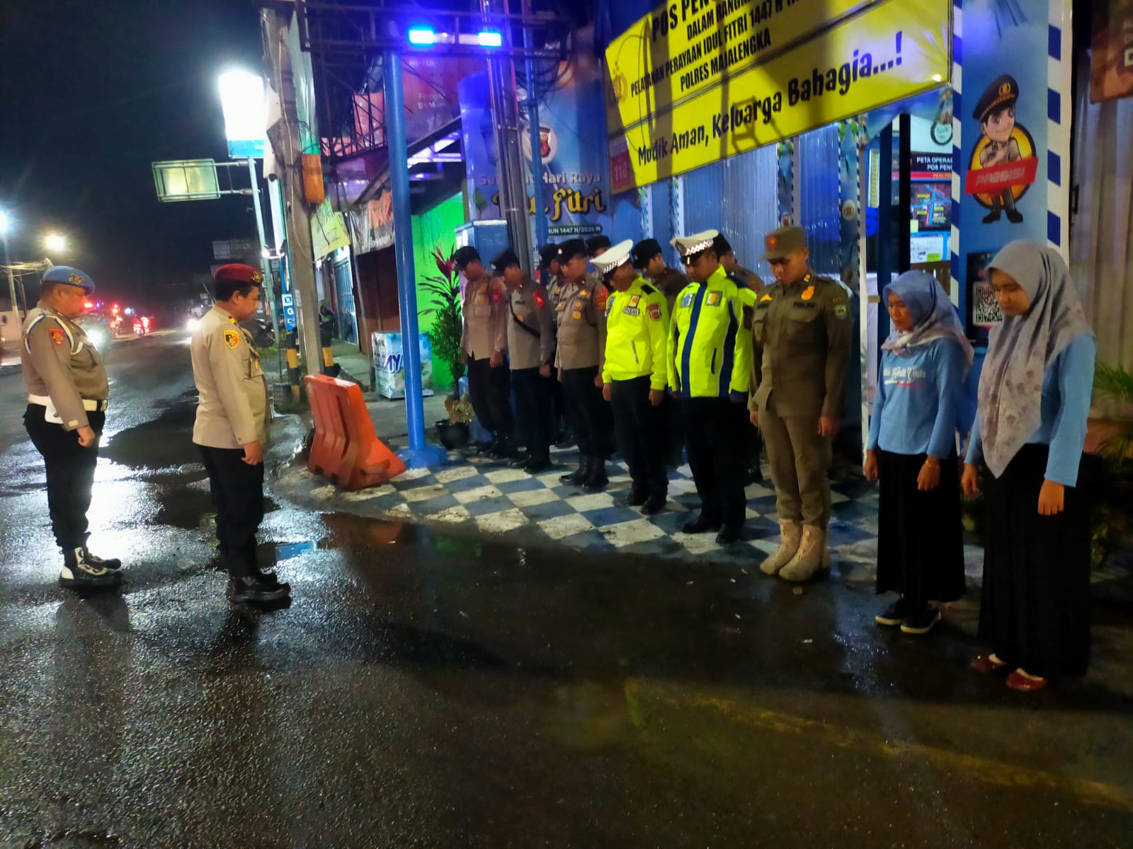 MAJALENGKA // Zonakabar.com – Dalam rangka menjamin keamanan dan kenyamanan masyarakat selama masa mudik Lebaran, jajaran Polres Majalengka Polda Jabar melaksanakan apel malam rutin di Pos Pengamanan (Pos Pam) Terpadu Kadipaten. Kegiatan yang menjadi bagian dari Operasi Ketupat ini dipimpin oleh Kapolsek Kadipaten AKP Budi Wardana, S.Pd., selaku Ka Pos Pam, yang dalam kesempatan tersebut diwakili oleh Panit 1 Reskrim Polsek Kadipaten IPTU Brigmono Rudiantoro, S.H., selaku Padal 1 Pos Pam Kadipaten. Jum’at (13/03/2026) malam.