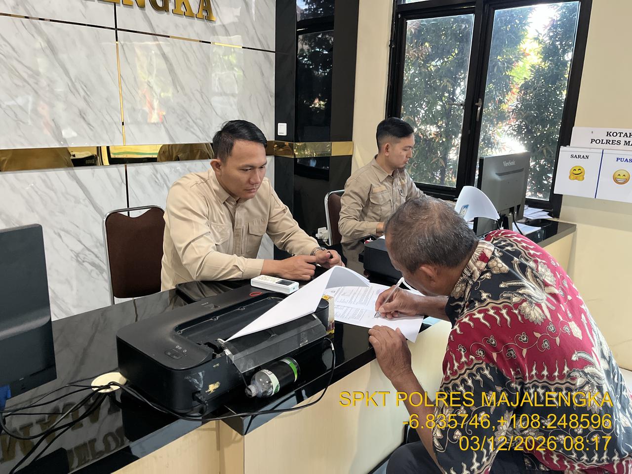 Dalam kegiatan pelayanan kali ini, petugas piket SPKT yang dipimpin oleh Pamapta 3 Ipda Mochamad Yusup bersama operator Brigadir Diar Arya Agustin dan Brigadir Prido Widodo, menerima kedatangan seorang warga bernama Rasadi. Warga yang berdomisili di Blok Ahad RT 01 RW 03, Kecamatan Palasah, Kabupaten Majalengka tersebut bermaksud melaporkan kehilangan dokumen berupa Kartu Keluarga (KK).