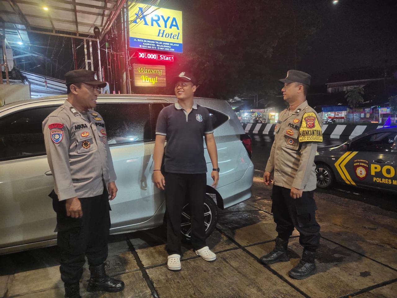 Dalam kegiatan patroli malam tersebut, personel Polsek Kadipaten menyambangi petugas satuan pengamanan (satpam) Hotel Arya. Petugas memberikan himbauan kamtibmas agar satpam senantiasa meningkatkan kewaspadaan, khususnya pada jam rawan malam hari, melakukan patroli internal secara berkala, serta mengawasi keluar masuk tamu demi mencegah potensi gangguan keamanan.