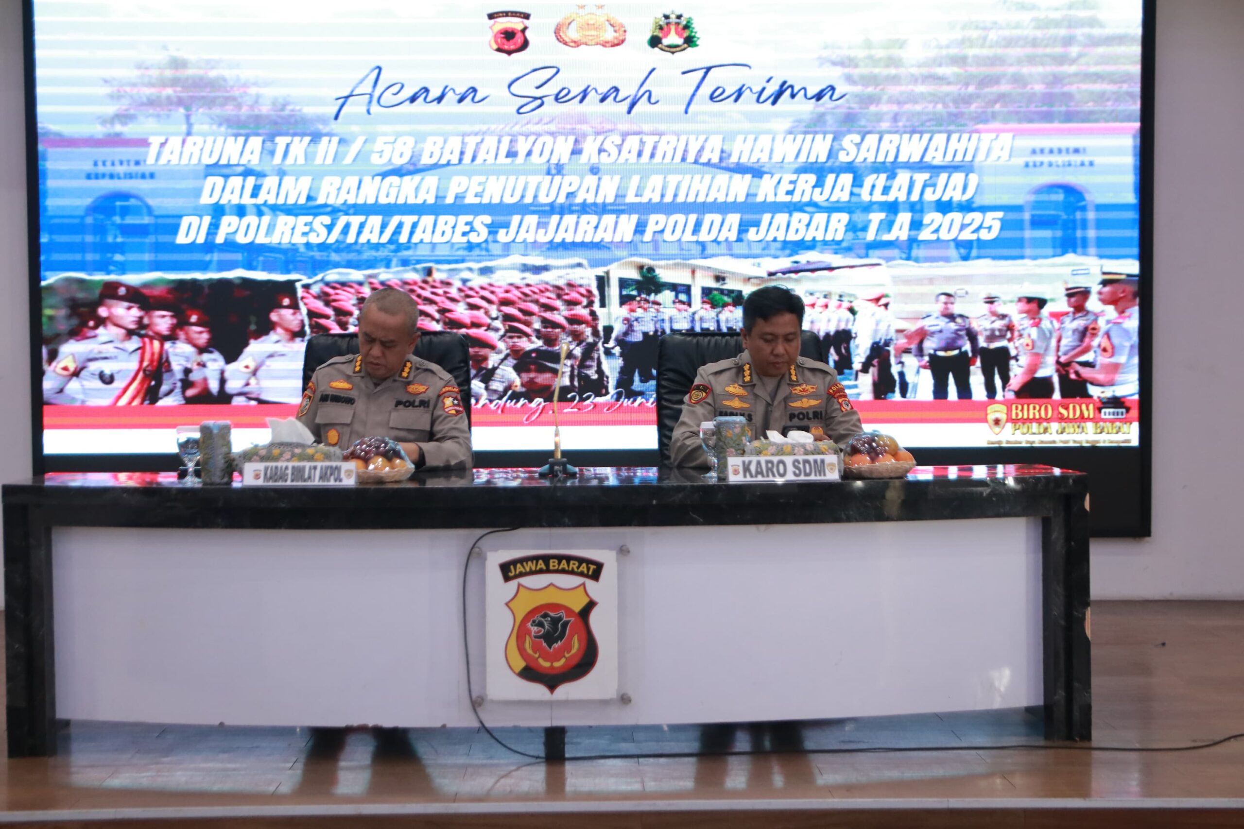 Sebanyak 236 taruna Taruna dan 34 Taruni Akademi Kepolisian Tingkat II Angkatan 58 yang telah melaksanakan kegiatan latja selama 20 hari terhitung Tanggal 4 S.D 24 Juni 2025 di beberapa Satuan Wilayah Di Wilkum Polda Jabar, secara resmi diserahkan kembali kepada pihak Akademi Kepolisian oleh Karo SDM Polda Jabar Dr. Fadly Samad SH., S.I.K., M.H.,M.Si