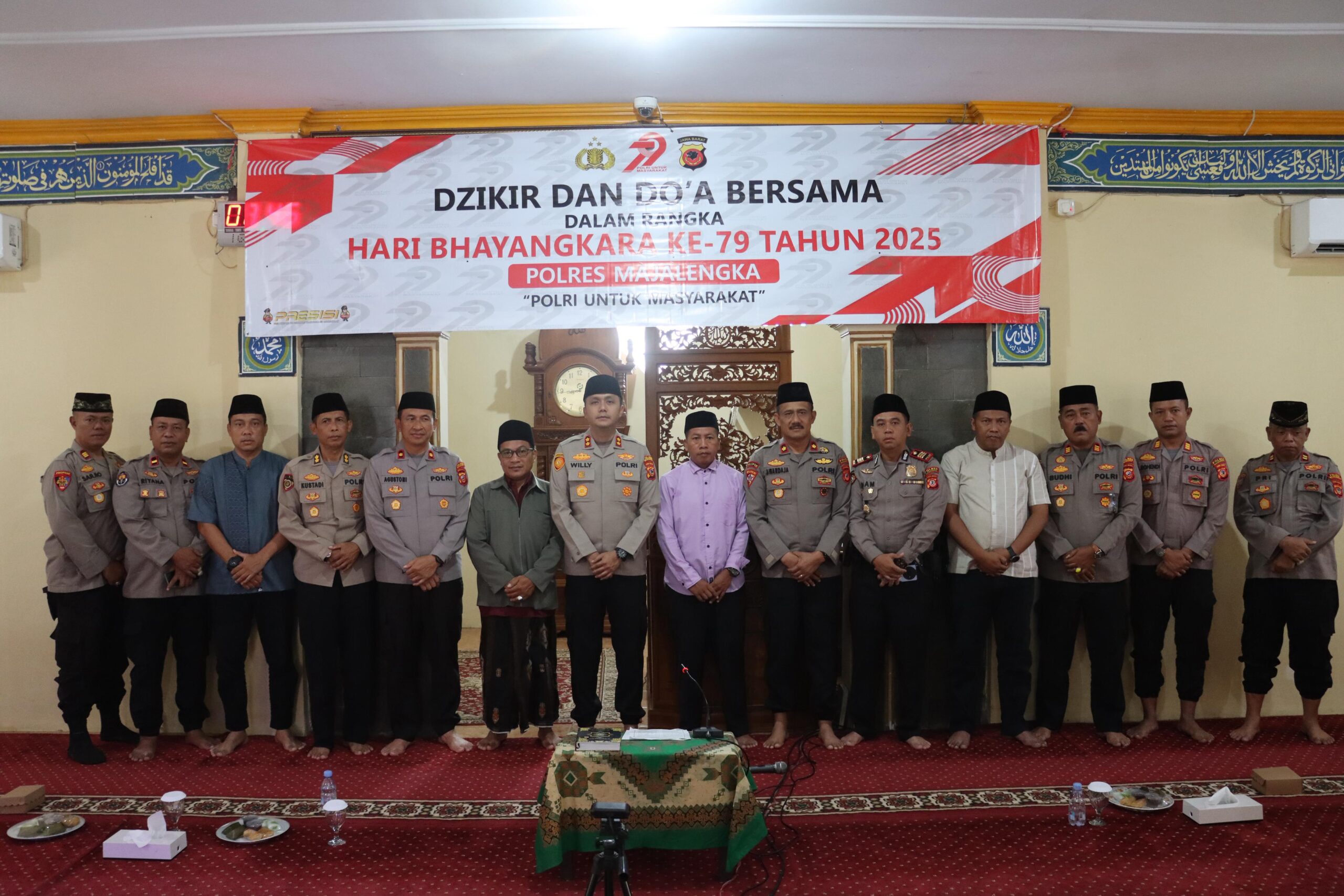 Majalengka, Zonakabar.com – Dalam rangka menyambut dan memperingati Hari Bhayangkara ke-79 Tahun 2025, Polres Majalengka Polda Jabar menggelar kegiatan Dzikir dan Doa Bersama yang diikuti oleh seluruh personel Polres Majalengka. Kegiatan berlangsung khidmat di Mesjid Jamiussolihin Polres Majalengka, Kamis (19/6/2025).