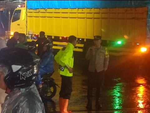 Personil Polsek Cikijing segera melakukan monitoring dan memberikan bantuan kepada warga yang terdampak serta melakukan pengaturan arus lalu lintas untuk mencegah kemacetan dan memastikan keselamatan pengguna jalan.