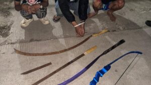 Dari lokasi sebuah warung di Desa Pecuk Kecamatan Sindang, petugas mengamankan barang bukti 4 bilah senjata tajam, 1 busur panah, 1 unit motor bebek, serta 1 jaket hoodie warna biru.