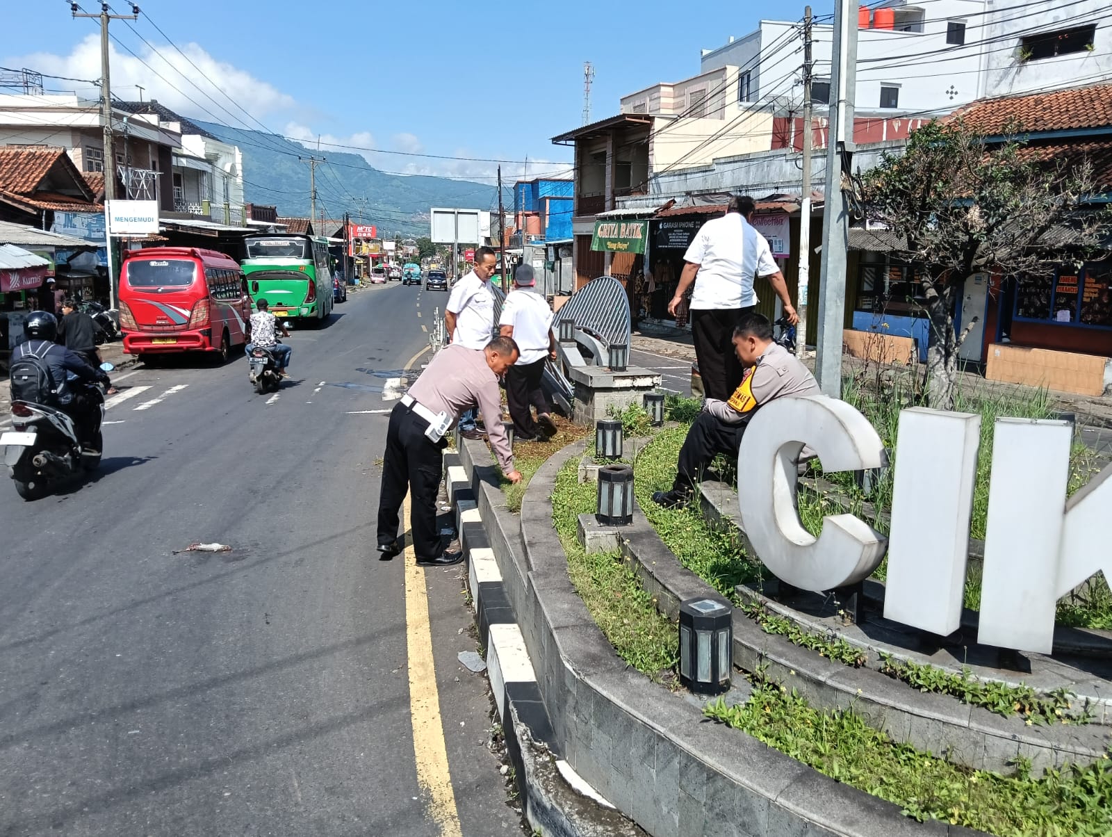Terlihat seluruh anggota Polsek Cikijing dan Petugas dari Kecamatan Cikijing sangat antusias dalam membersihkan Taman Simpang Tiga Cikijing.