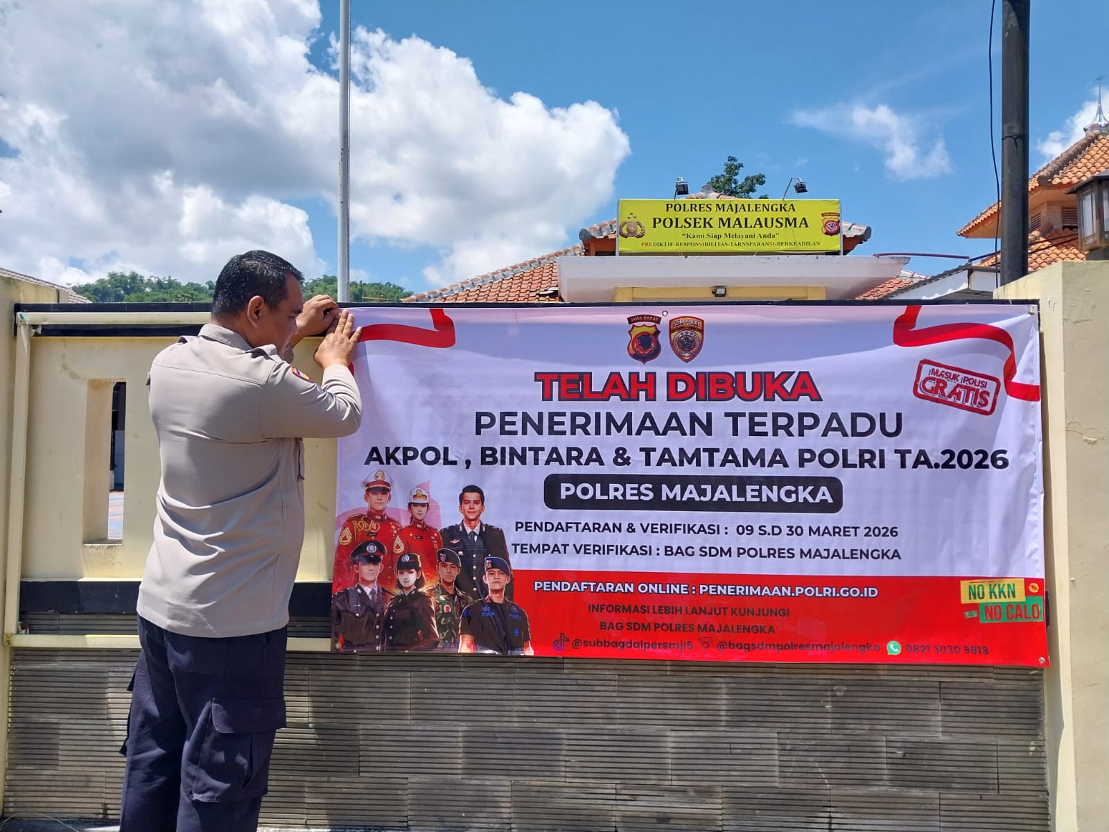 Majalengka, // Zonakabar.com Pabanrim Polres Majalengka melaksanakan kegiatan pemasangan spanduk Penerimaan Terpadu Anggota Polri Tahun Anggaran 2026. Kegiatan tersebut berlangsung di depan Mako Polsek Malausma. Rabu (11/3/2026).