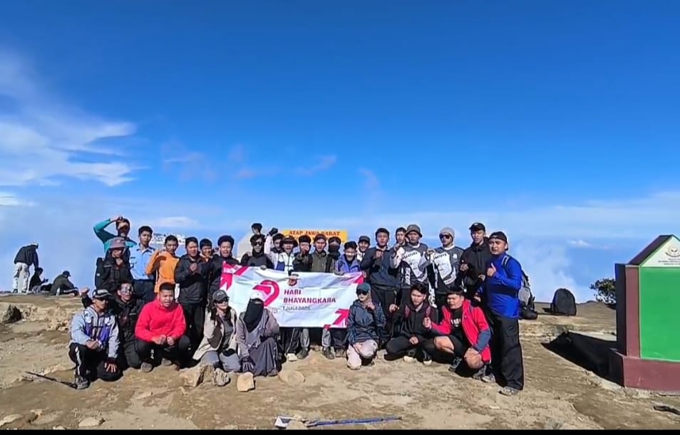 Di puncak Gunung Ciremai, tim Pencinta Alam yang di Pimpin langsung Kapolsek Argapura Polres Majalengka AKP Ilham Dinata melaksanakan pengibaran bendera merah putih dan pembentangan Spanduk Hari Bhayangkara Ke-79 sebagai wujud kecintaan Polri terhadap alam dan semangat kebangsaan, Sabtu, 21 Juni 2025.